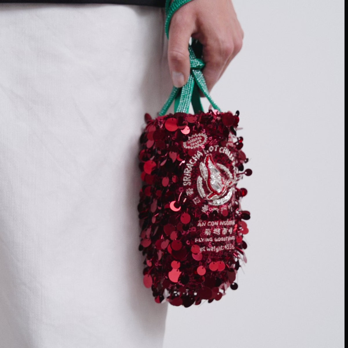 External features: Red and white sequins, beaded Sriracha logo and strap