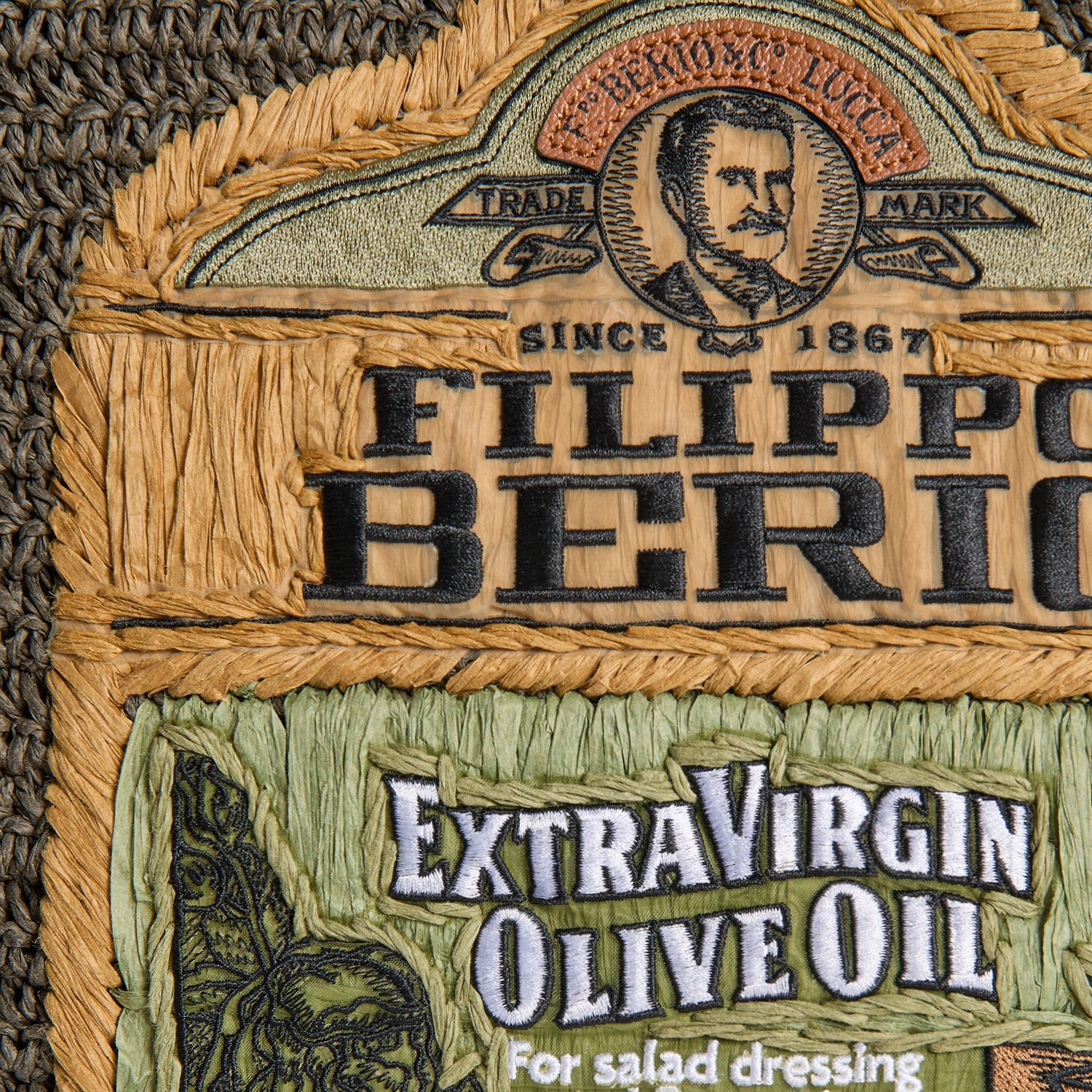 External features: Woven Filippo Berio logo, leather adjustable handles and logo-embossed magnetic closure