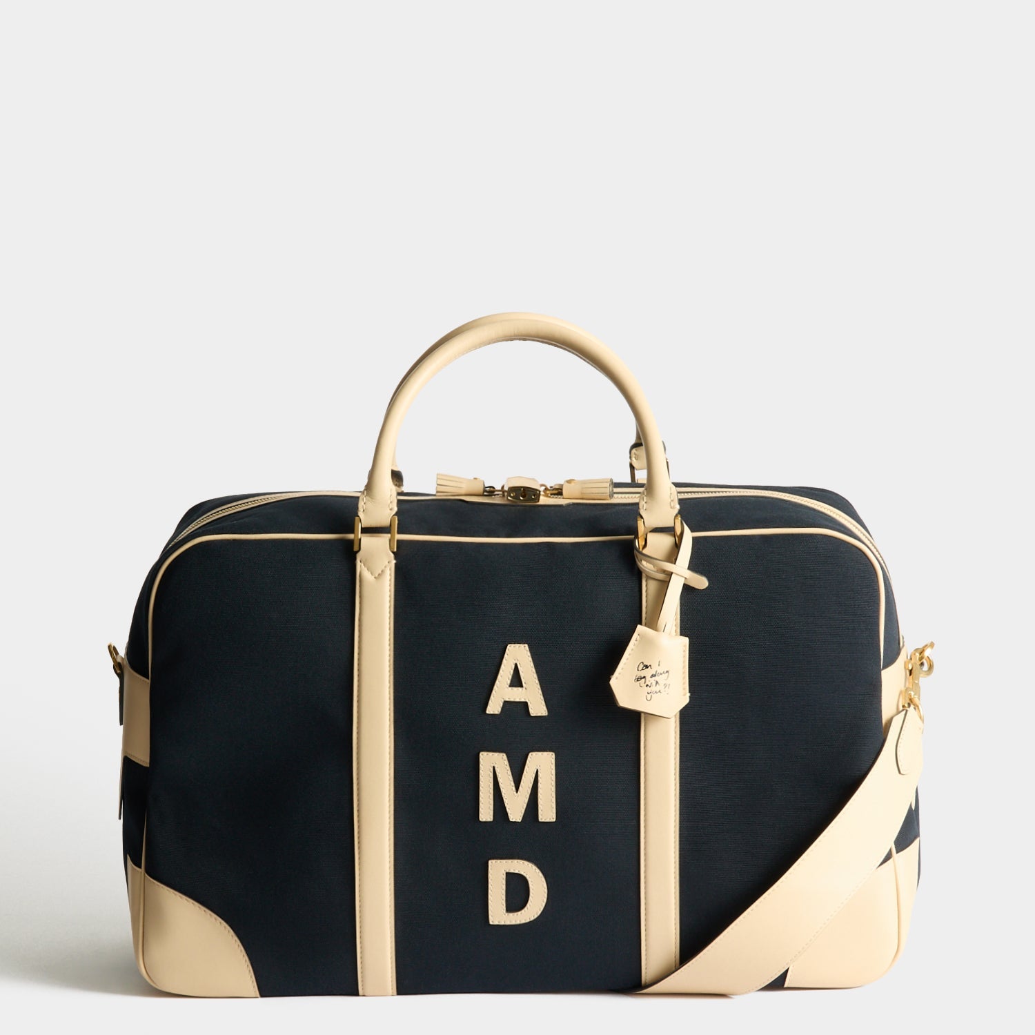 Inspired by vintage luggage, the Bespoke Walton bag is crafted from leather-trimmed canvas and detailed with striped webbing – with top handles and a long strap. The lock-secured, double-tassel zip opens to a generously sized interior, with leather straps (to keep items in place) and a zipped, slip pocket for smaller things. Add your monogram in leather on the front, an embossed name on the tab, and a handwritten message on the key cover.