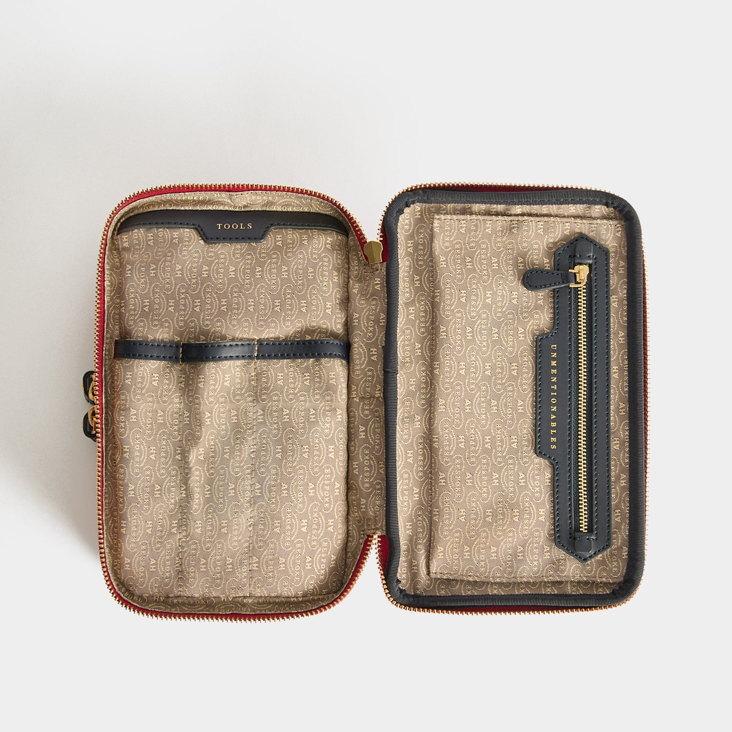Internal features: Zipped pocket labelled ‘UNMENTIONABLES’, open pocket labelled 'TOOLS', main zipped pocket