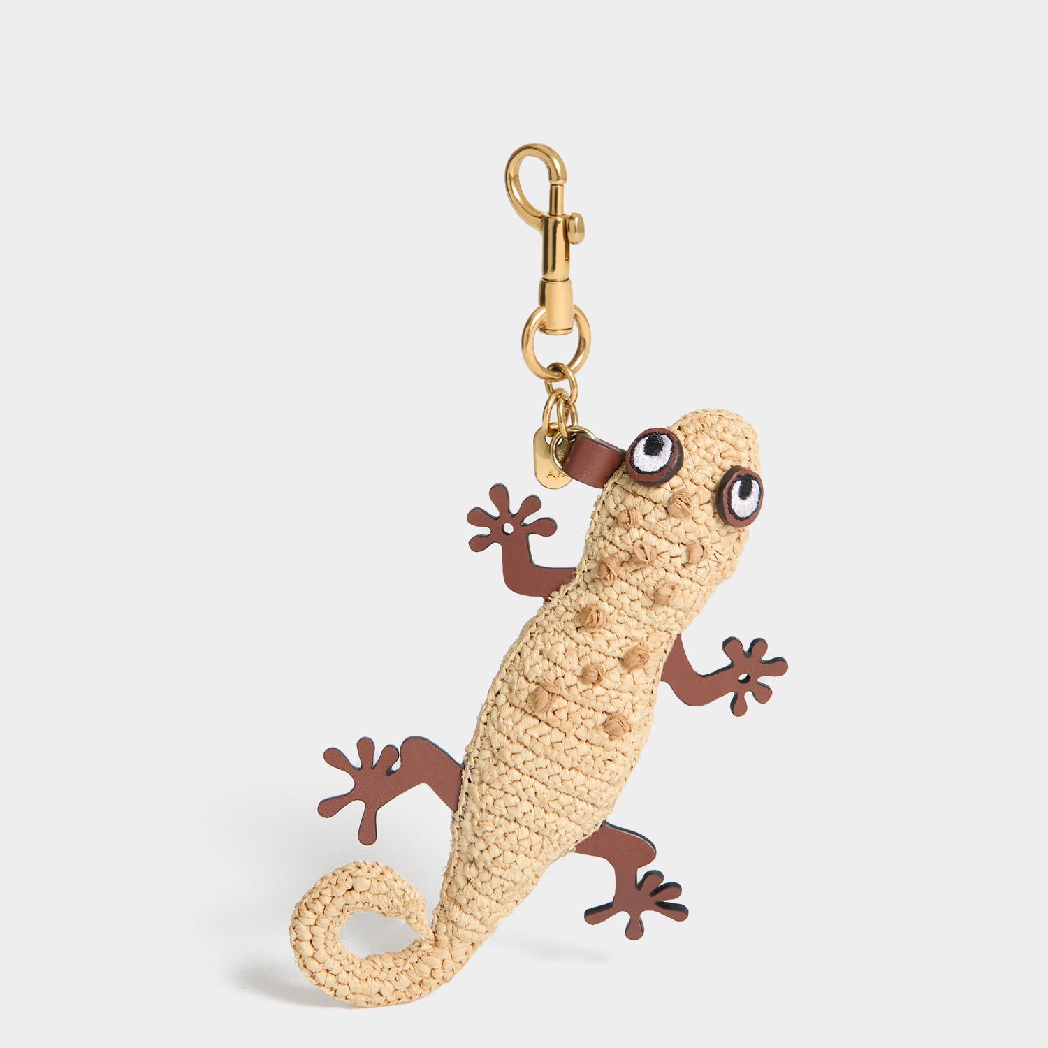 Personalise your summer bag with the Gecko charm. It is woven from natural raffia and finished with embroidered leather eyes and articulated legs, as well as a gold-tone clasp for clipping onto your favourite tote or basket bag.