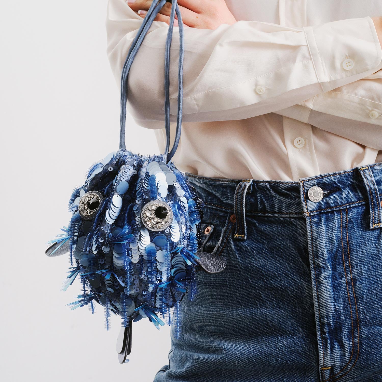 The Blowfish Cross-Body will be such a fun addition to cocktail outfits. It’s made from cornflower-blue satin, embellished with sequins and beads, and finished with leather fins and crystal-encrusted eyes. Tote it in-hand by the drawstring ties or attach the long chain strap to wear it cross-body.