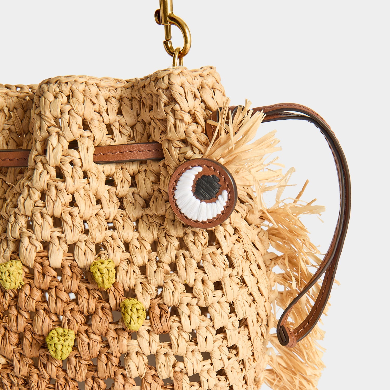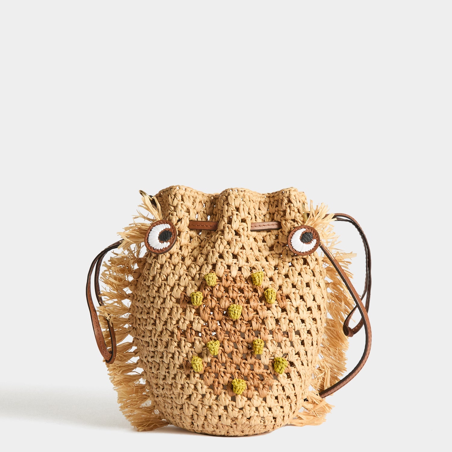 The Creature Cross-Body is a playful alternative to the classic basket bag, woven from natural and pecan-hued raffia to resemble a sea-dwelling character. It has eco-leather eyes, a drawstring closure – which also functions as handles – and a detachable long strap, for cross-body styling.