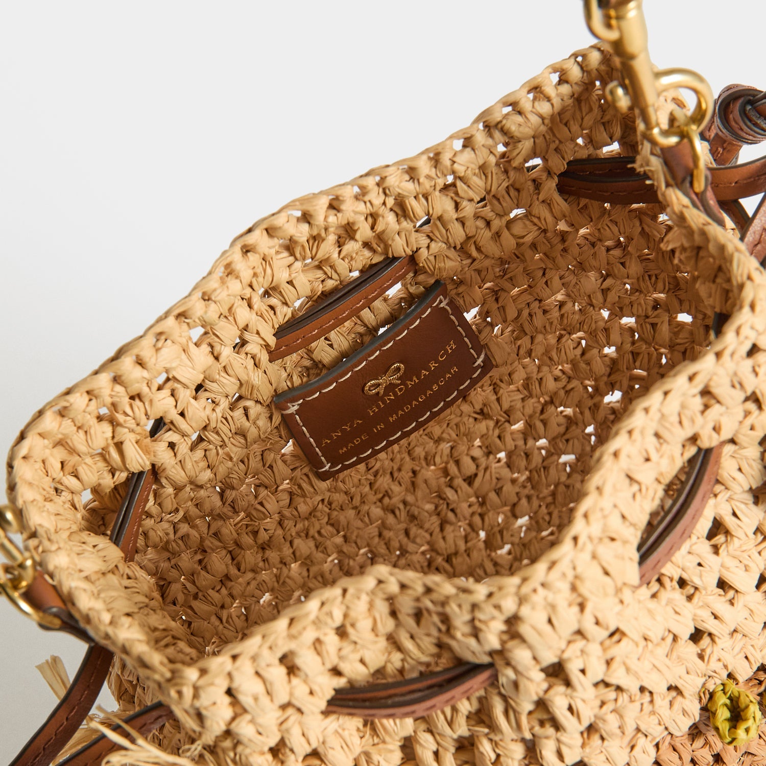 Internal features: Leather tab with Anya Hindmarch logo and bow