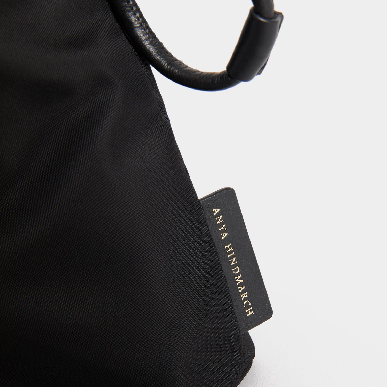 The Eyes Drawstring Pouch will add a touch of fun to evening outfits. It is crafted from ECONYL® regenerated nylon, decorated with a pair of leather eyes, and finished with drawstring ties, which can be looped around the wrist. Inside, there’s room for a phone, cardholder, keys and a couple of essential makeup items.