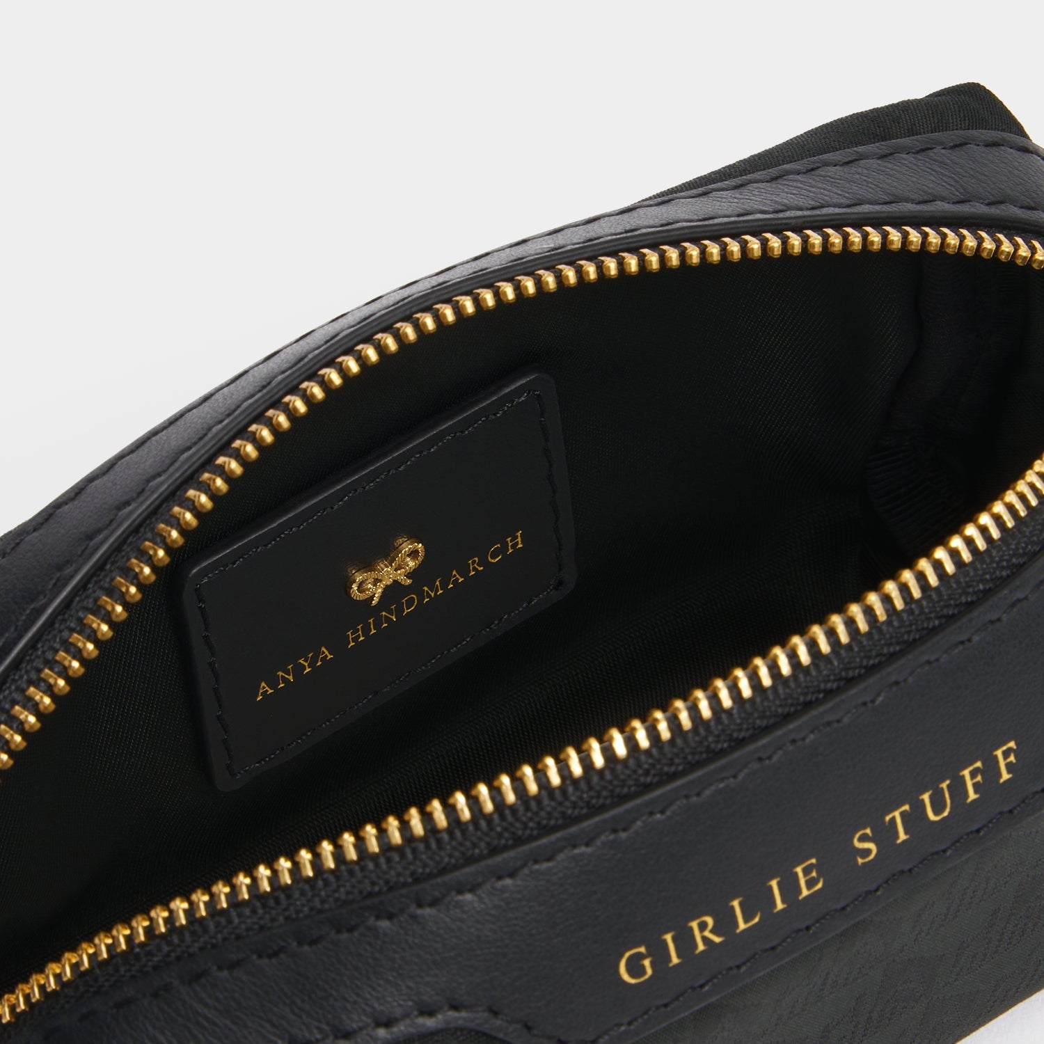 Made from monogrammed nylon, the latest incarnation of our classic Girlie Stuff Pouch is surrounded by smooth-leather trims for a hardy, durable silhouette. Small enough to stow into your suitcase or overnight bag, but still spacious enough to store your essentials inside, this handy hold-all is perfect for keeping those essential things close at hand - whether it’s spare bits of makeup, charging cables for long journeys or jewellery that you want to keep separated.