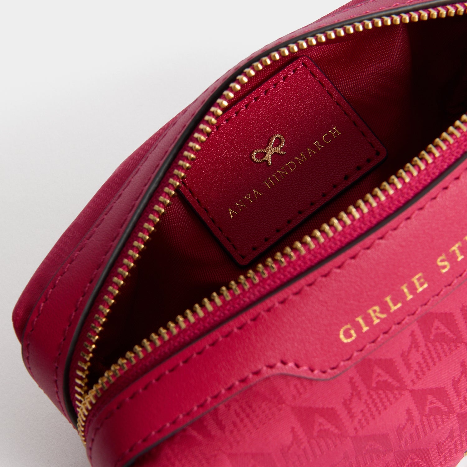 External features: Gold-tone Anya Hindmarch bow, leather trim with labelled 'GIRLIE STUFF' nameplate, gold-tone zip with leather zip pulls