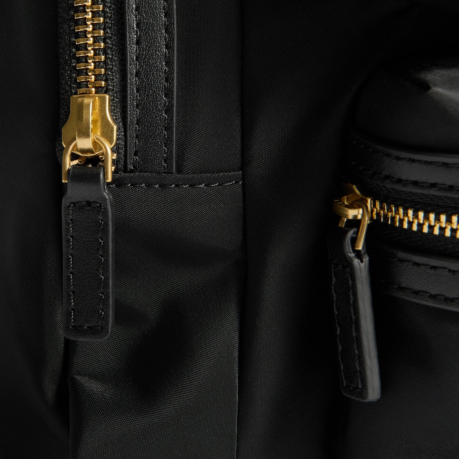 External features: Top handles, gold-tone hardware, Pockets labelled BITS & BOBS, EARPHONES, REFUEL and PHONE, side pockets labelled LOTIONS & POTIONS, WATER and SHOES, back pocket labelled FLOOR MAT, with pull out drawsting fastening