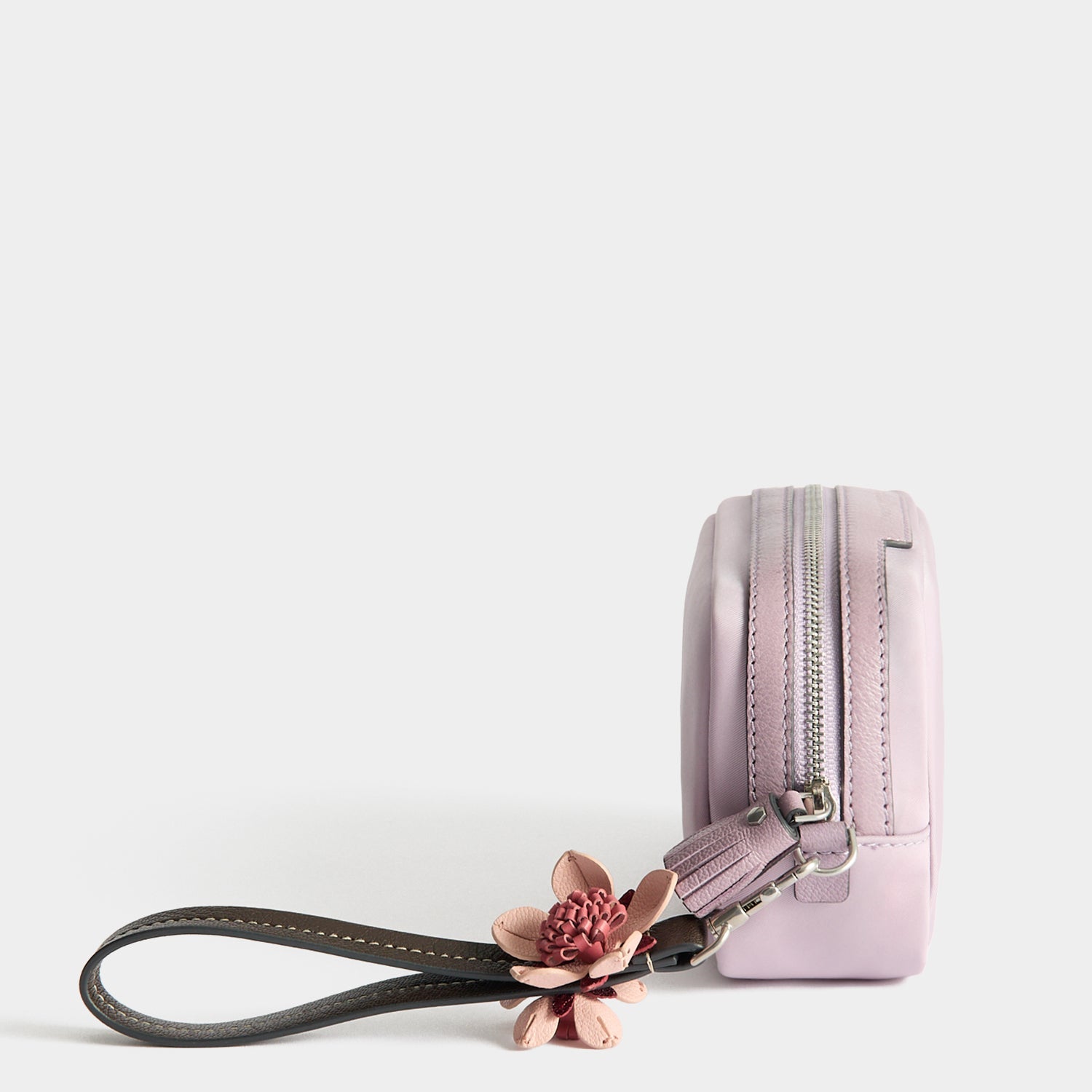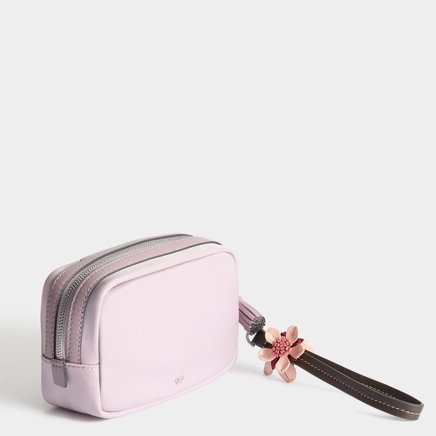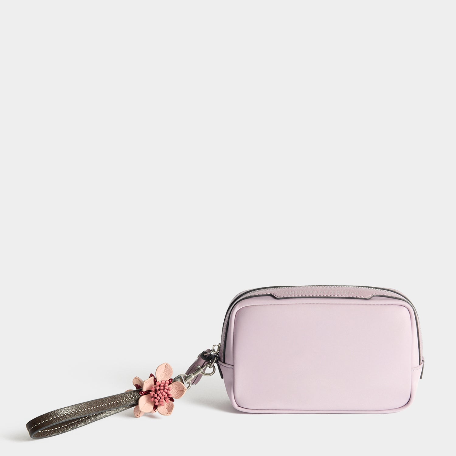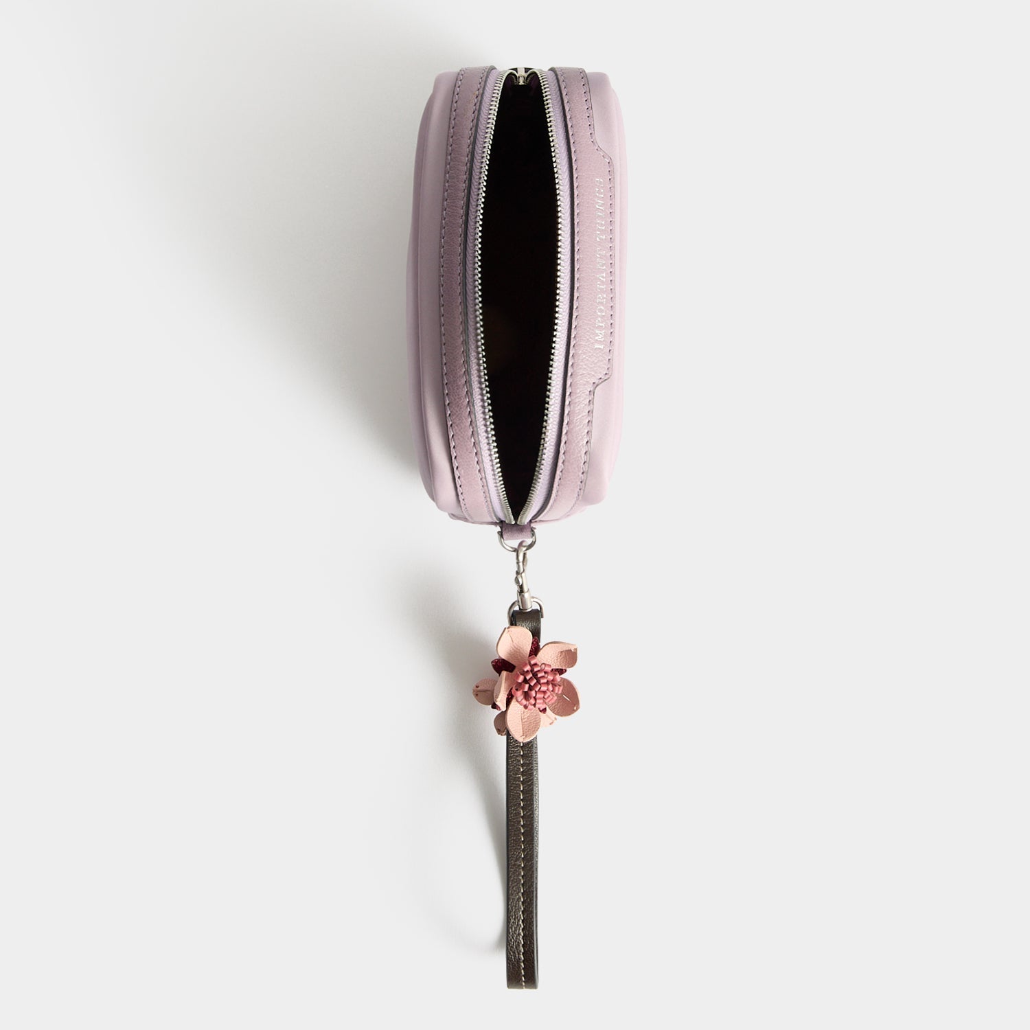 External features: Silver-tone Anya Hindmarch bow, leather trim with labelled 'IMPORTANT THINGS' nameplate, silver-tone zip with leather zip pulls and flower charm-adorned wristlet strap