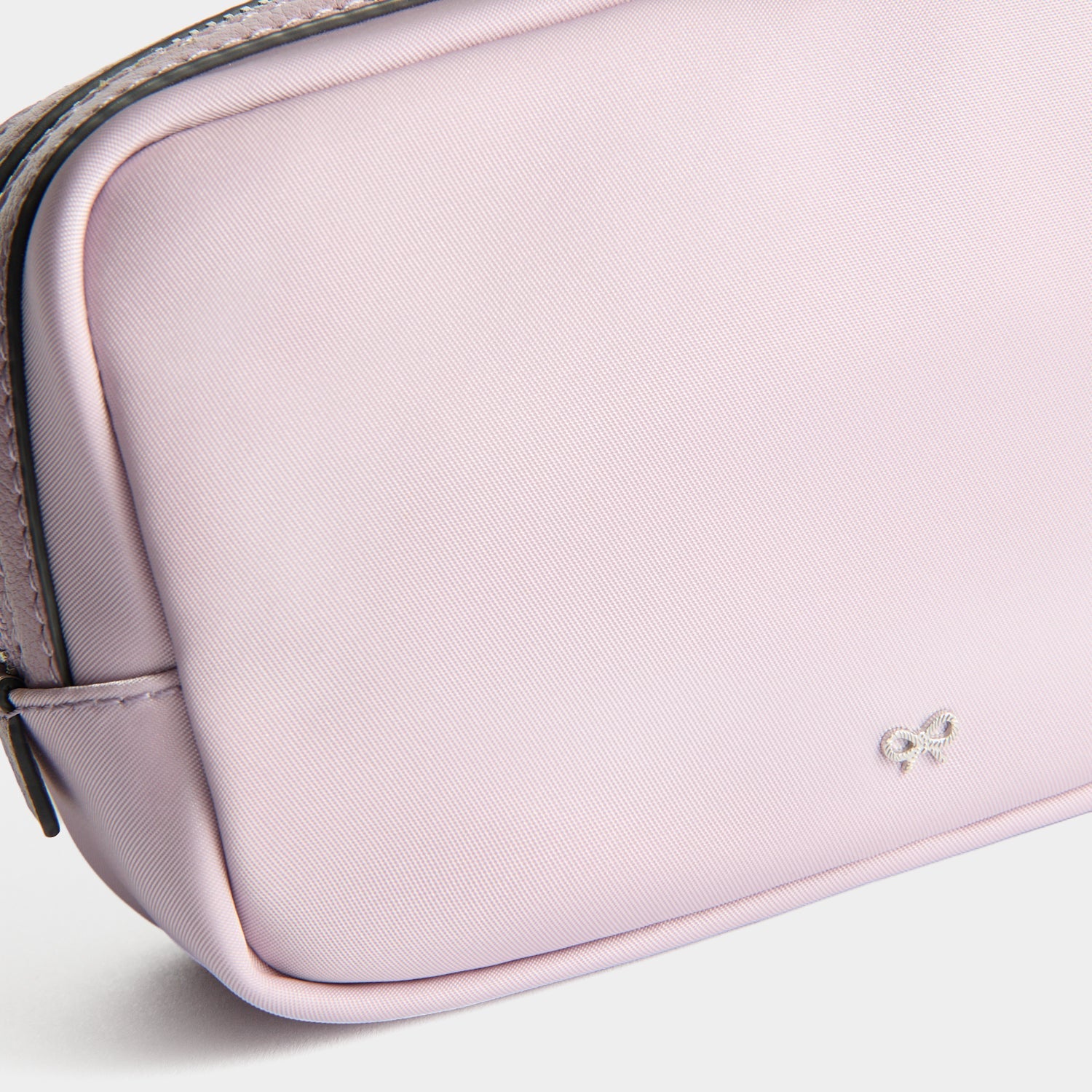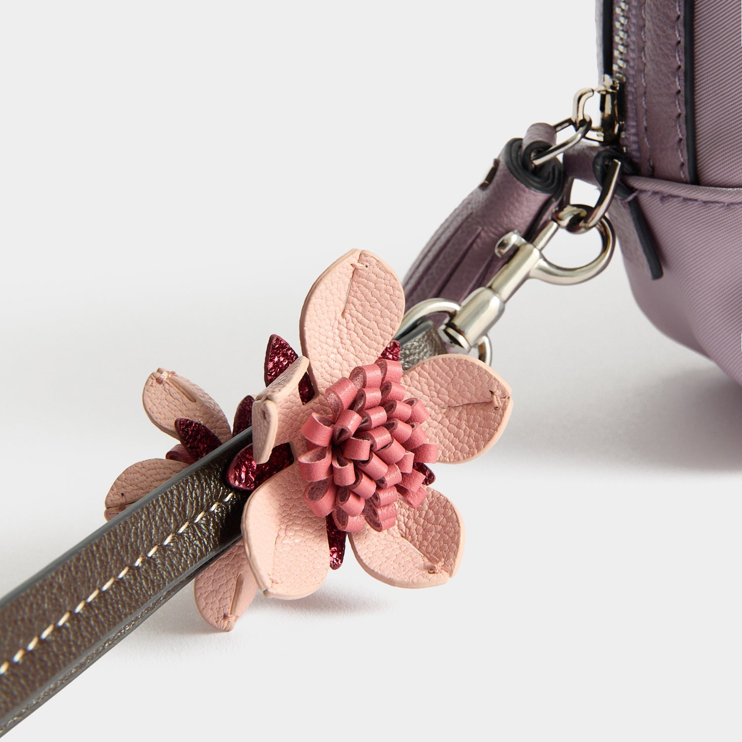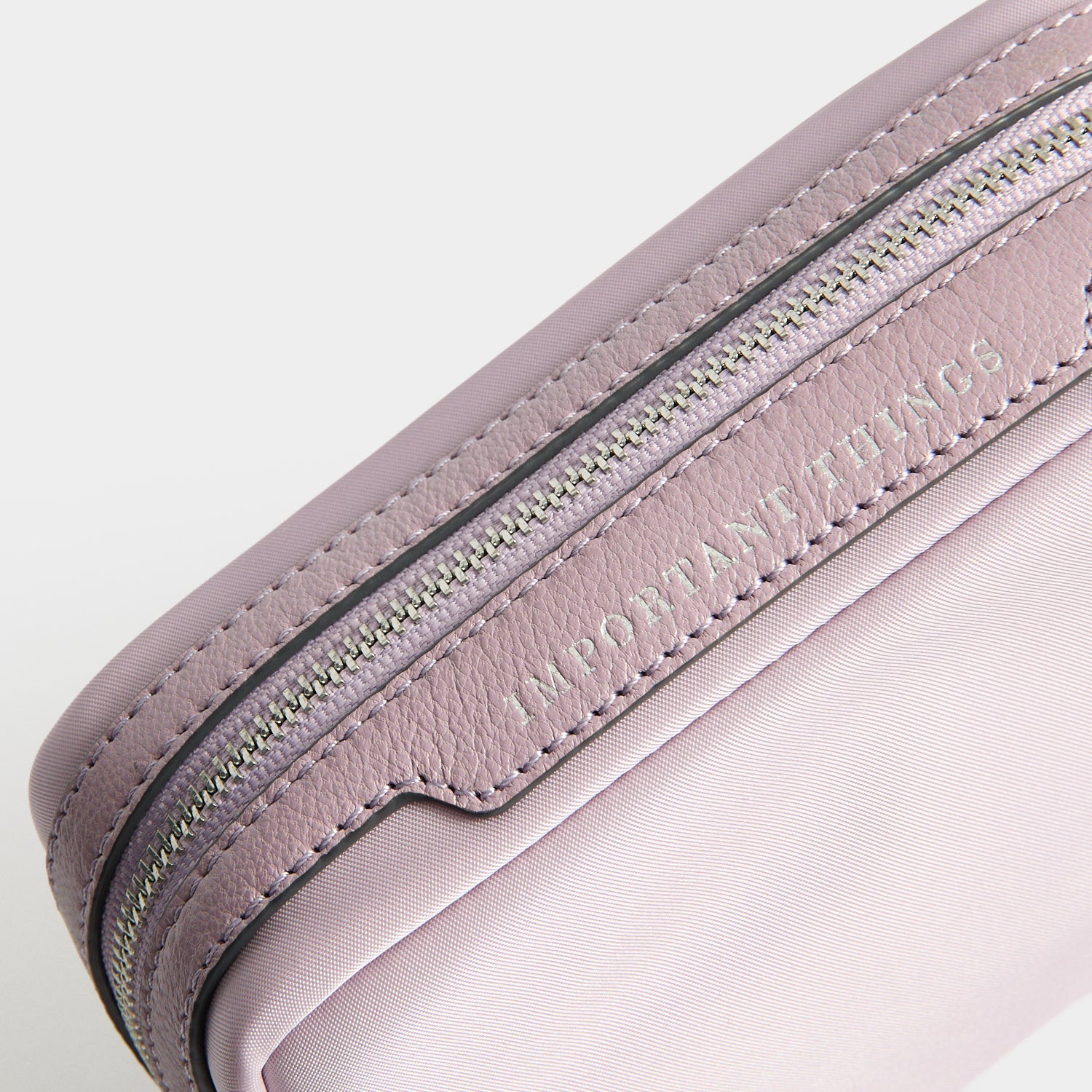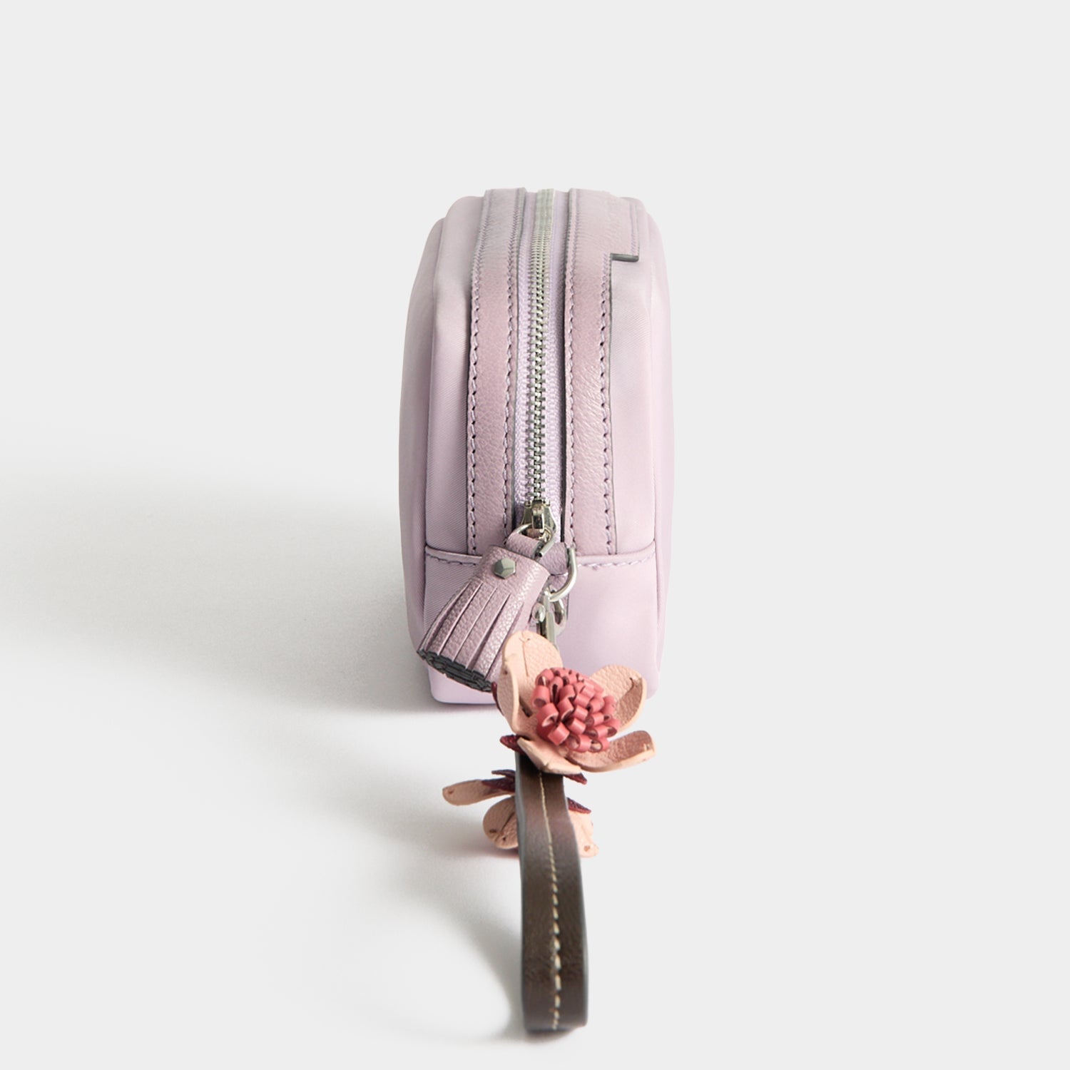 External features: Silver-tone Anya Hindmarch bow, leather trim with labelled 'IMPORTANT THINGS' nameplate, silver-tone zip with leather zip pulls and flower charm-adorned wristlet strap