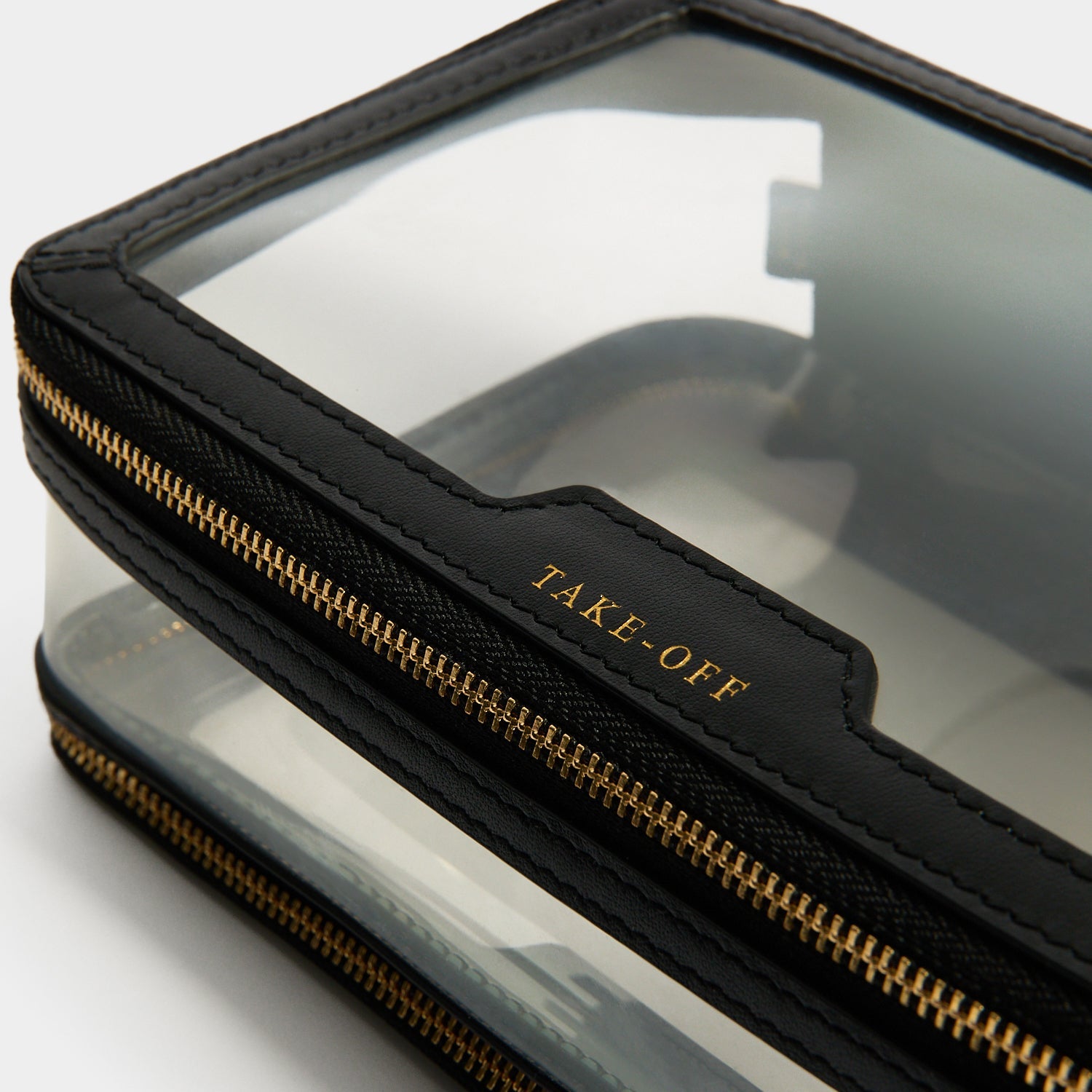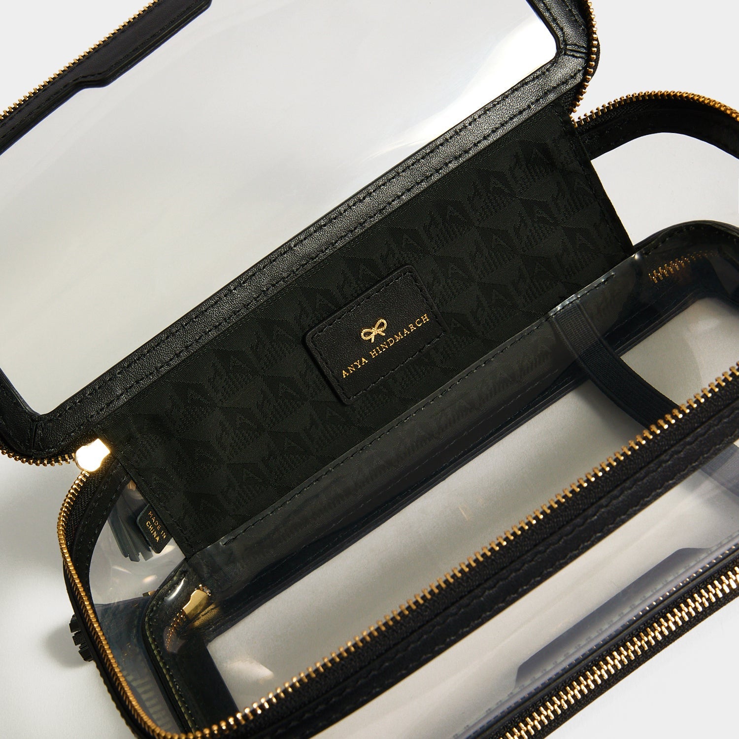 This clear In-Flight Case is the perfect travel accessory. With a clear exterior to help you instantly find what you're looking for, the case has two zipped compartments; one for all those essentials to keep you feeling comfortable on take-off and one for those little touches when you arrive. Beautifully finished with patent trim, signature tassel zip fastenings and Anya Hindmarch bow.