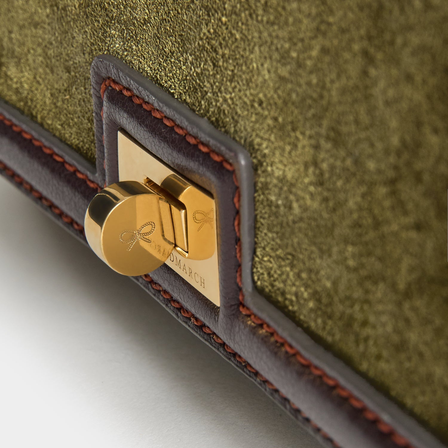 - DESCRIPTION- If you appreciate the fine craftsmanship that goes into the Mortimer bag, you'll love this version. The Mortimer Cross-Body Frame bag is made from bonsai-green suede and ‘framed’ by grape-hued silky calf leather trims – both materials have been awarded gold certification by the Leather Working Group. The gold-tone turnlock opens to reveal space inside for your phone, wallet and glasses, with a slip pocket for cards, and the long strap can be adjusted to your ideal length. - Item number: 5050925203999