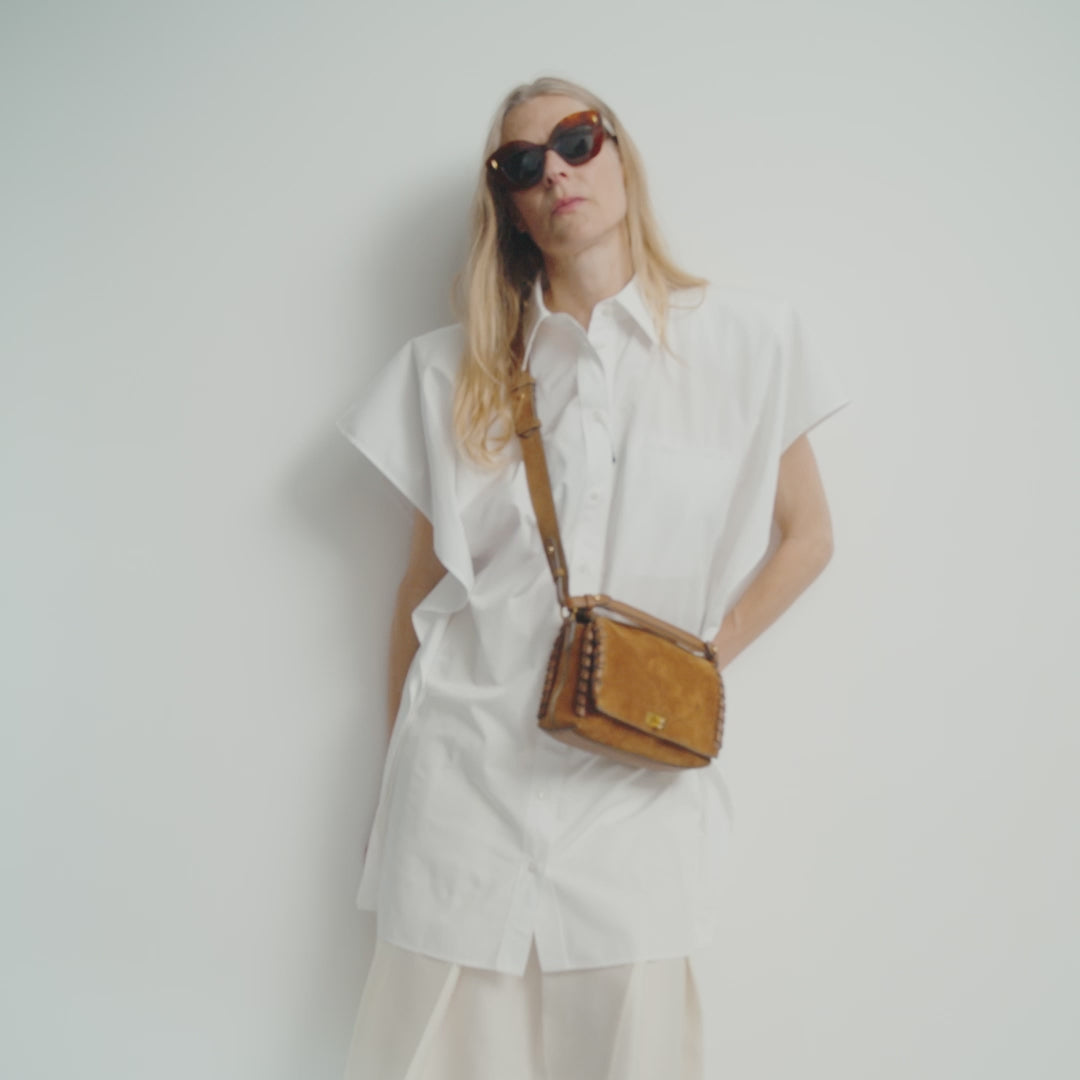If you appreciate the fine craftsmanship that goes into the Mortimer bag, you'll love this easy, everyday, cross-body version. It is handmade in Florence from pecan-coloured reverse suede, rated Gold by the Leather Working Group, and finished with woven leather edges and gold-tone hardware – including the bow and logo-embossed turn-lock, a Mortimer signature. It can be carried by the top handle or adjustable long strap, or you can remove the strap entirely and use it as a clutch. Stow your phone, wallet, and glasses inside, using the single slip pocket for your most-used card.