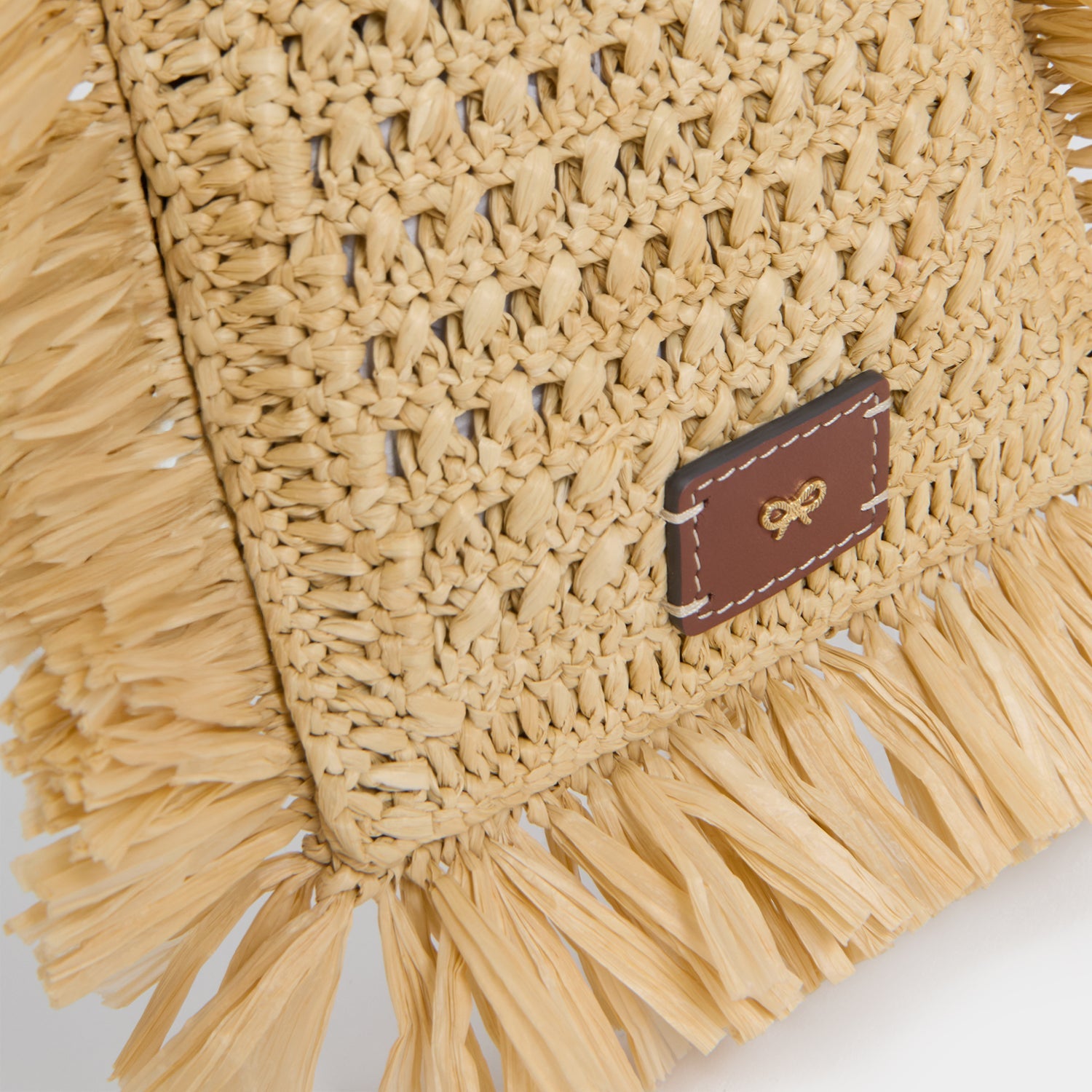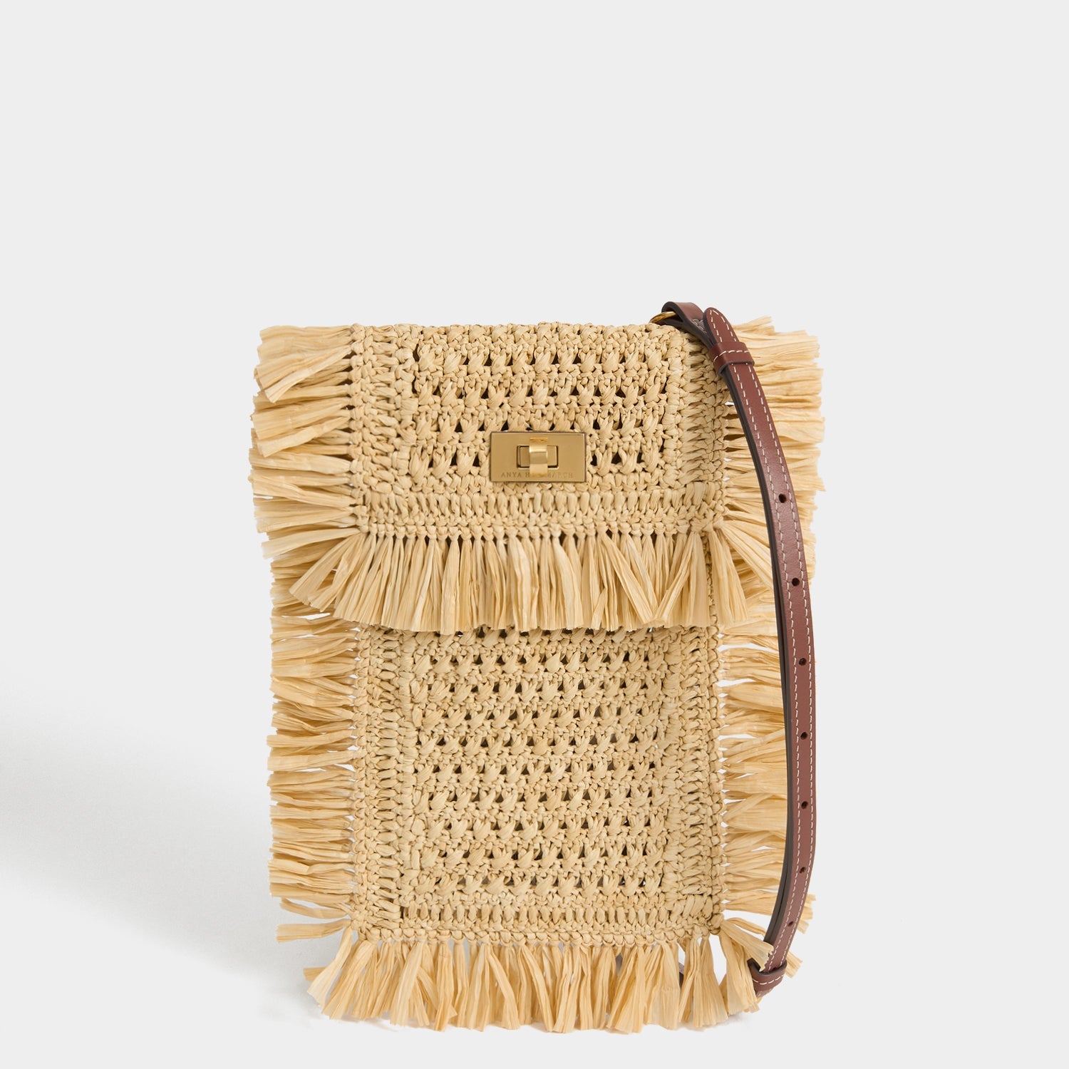 This Phone Pouch is woven from natural raffia, making it a summer holiday staple. It has fringed edges, a gold-tone turnlock closure and a long cross-body strap which can be adjusted to your desired length. Note the bow-adorned leather patch on the reverse.