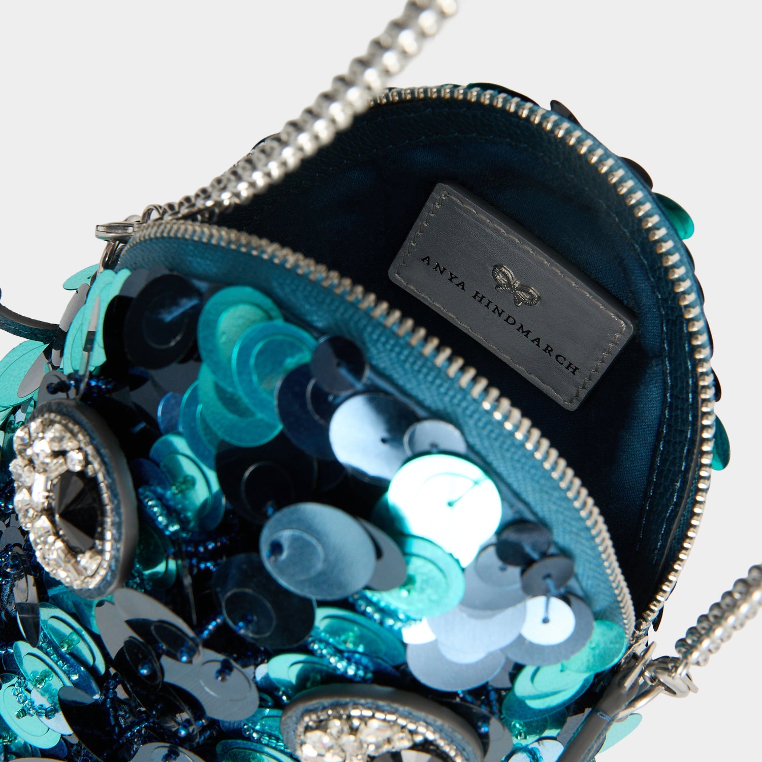 - DESCRIPTION- Embellished with scores of tonal sequins and crystal-encrusted eyes, the Bug Pouch is as intricately crafted as it is playful. Wear it cross-body by the chain strap for evening events, or wear as a clutch using the detachable wrist strap, keeping your phone, keys, cards and a couple of makeup items inside the dark petrol-blue satin interior. - Item number: 5050925204361
