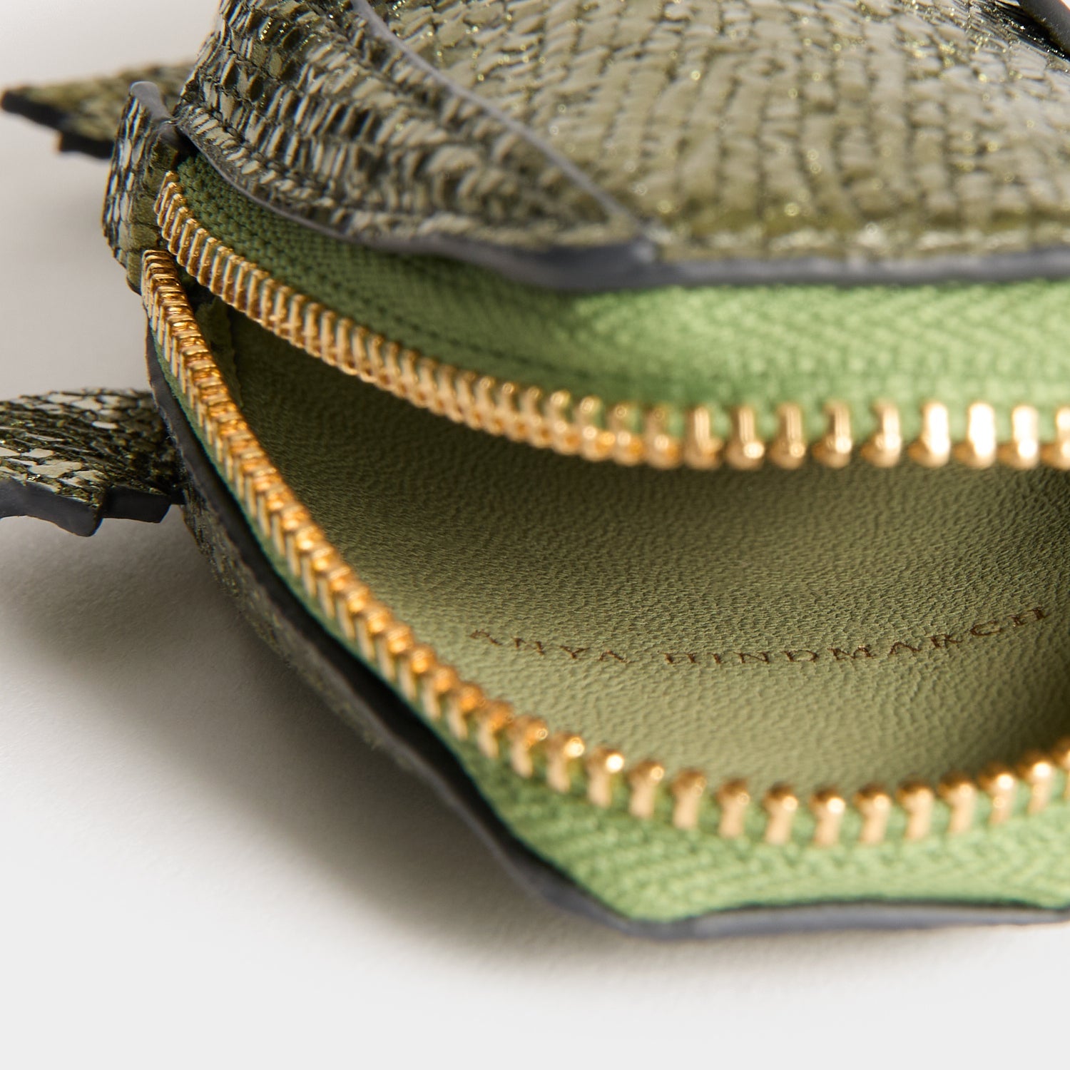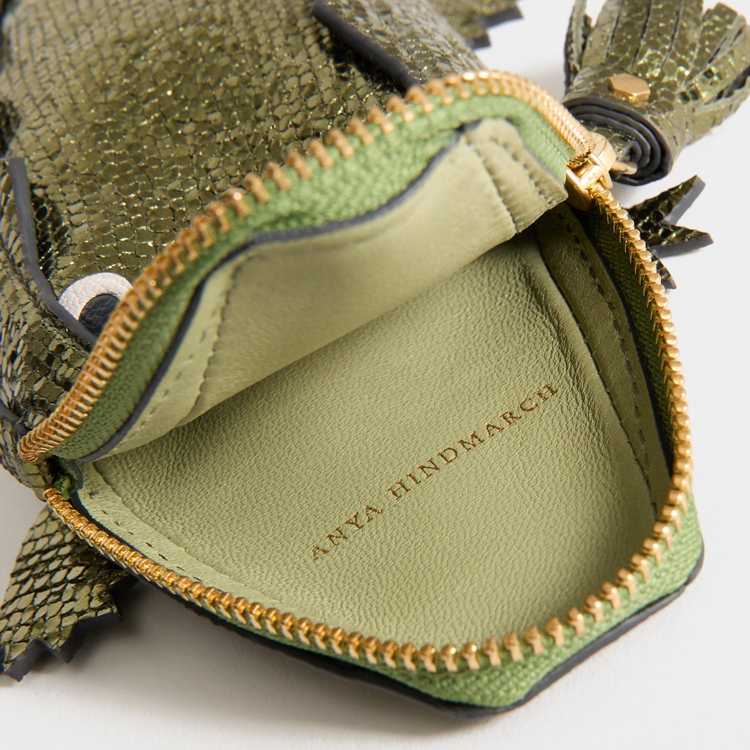The Crocodile Pouch is as practical as it is playful, with space inside for stationery, essential makeup, or other smaller items you want to keep organised within a larger tote. It’s crafted from olive-green, shimmering metallic leather – specially selected for its Leather Working Group certification – and opens via a tassel-zippered ‘mouth’.