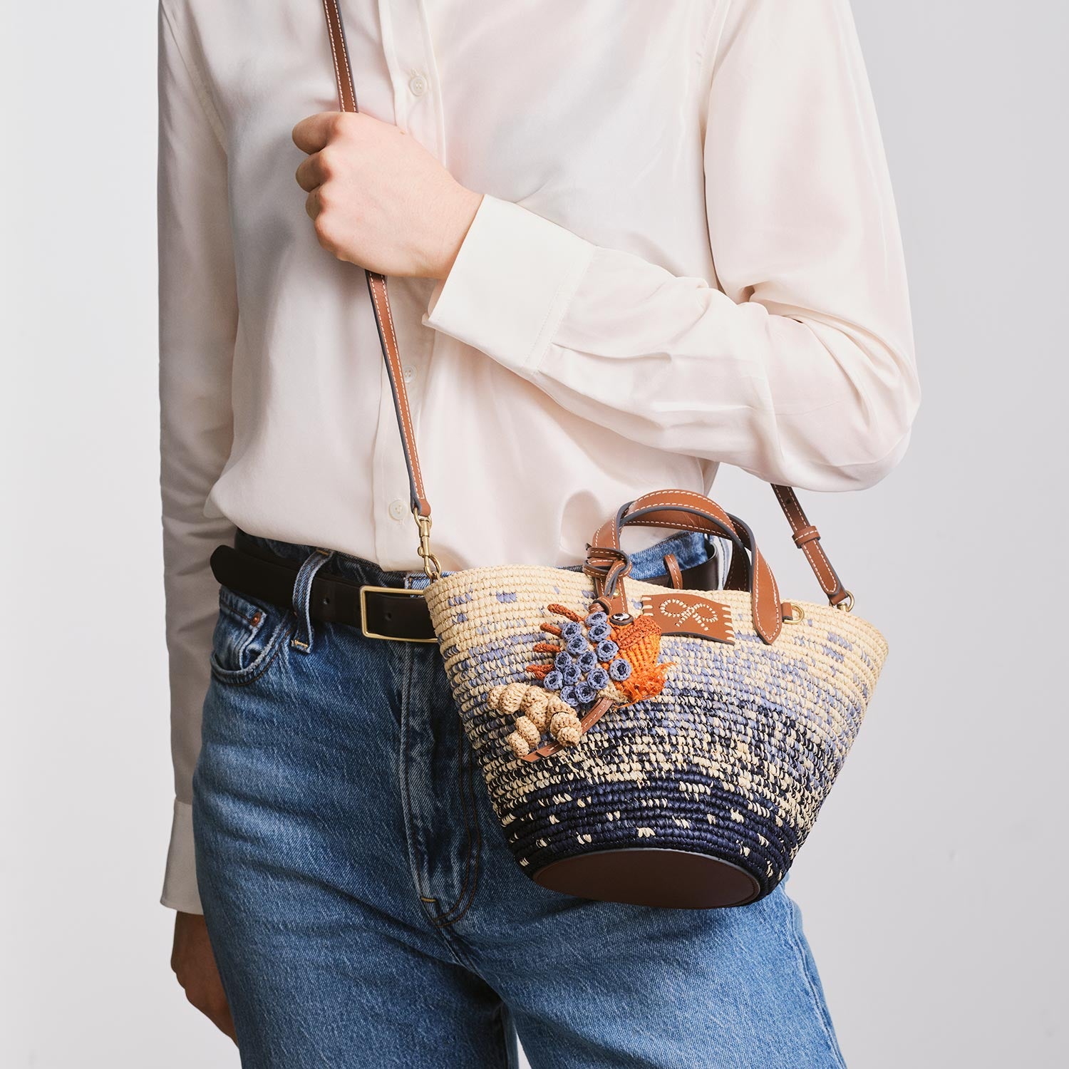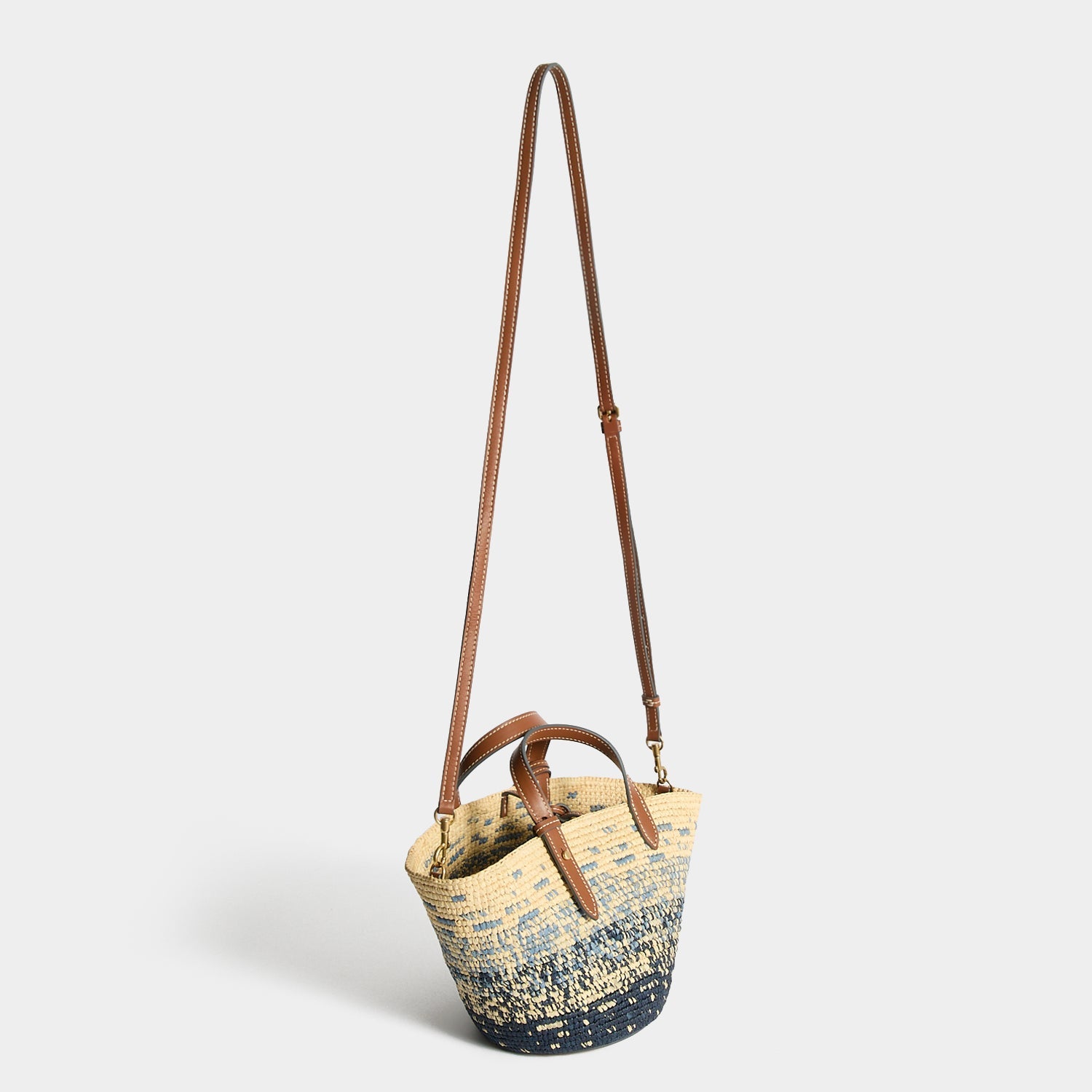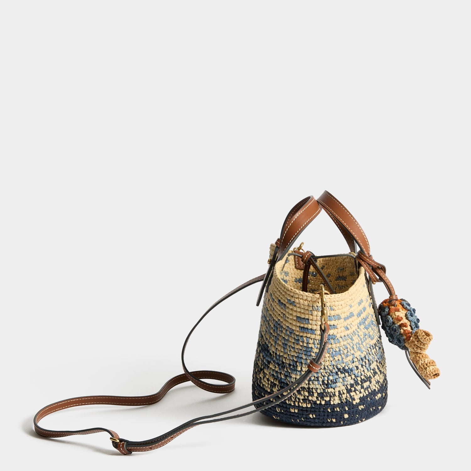 Perfectly sized for day trips and beachside evenings alike, this compact basket bag is a holiday must-have. It is handwoven from raffia in a dégradé design and fitted with adjustable leather top handles, a detachable long strap for hands-free styling and an intricately crafted fish charm. Use it to stow sunglasses, a card holder, and makeup essentials.