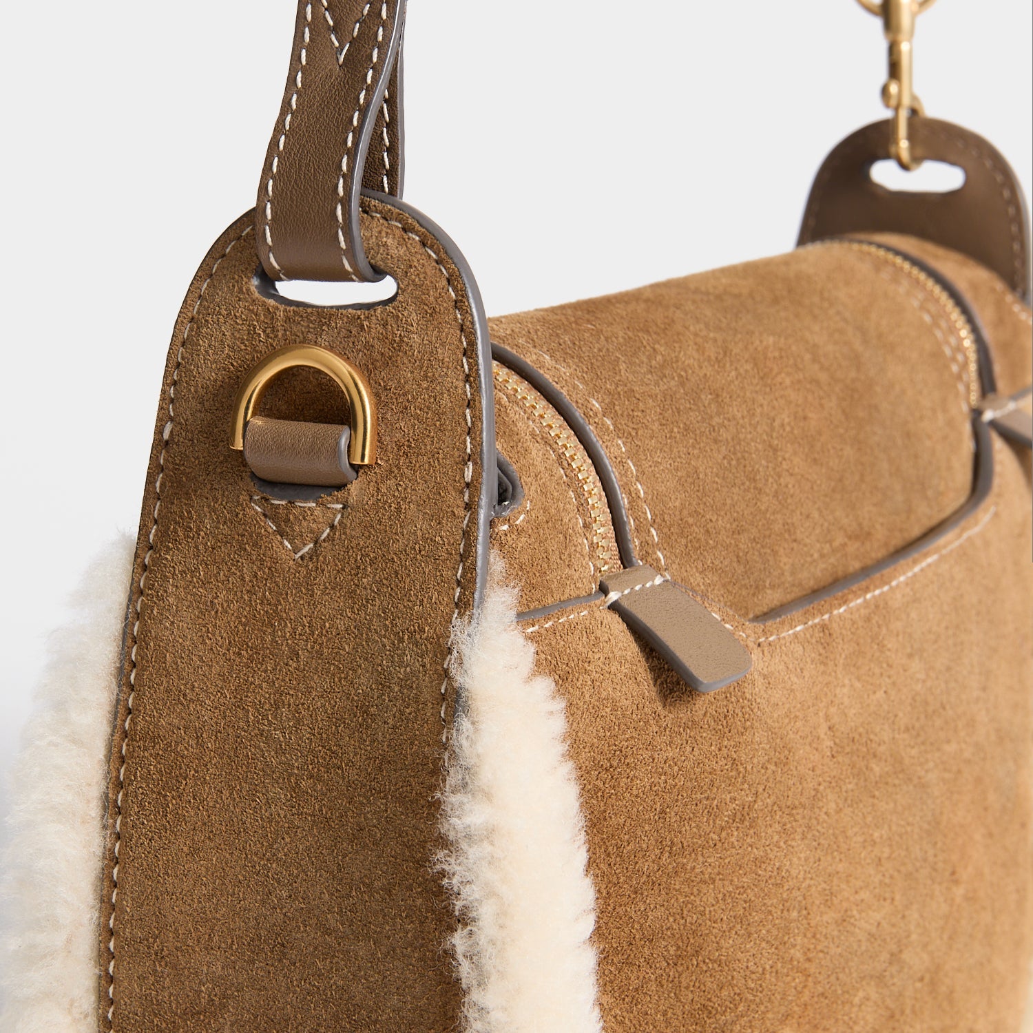 - SPECIFICATION & MATERIALS- Dimensions: H16cm W23cm D7cm - Materials: Shearling, Suede Leather - External features: Two-way zipped flap and suede adjustable double strap - Internal features: Labelled Leather sections - Sustainability: LWG Rated Leather Item number: 5050925203944
