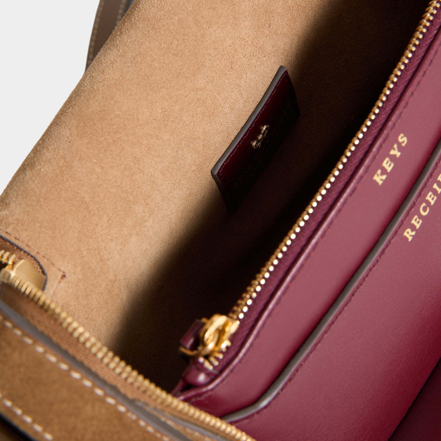 - DESCRIPTION- Crafted from suede with a shearling trim, the Small Vere Cross-Body can be worn in all seasons – but it really comes into its own in autumn and winter. It opens via two tasselled zips to a merlot-red, leather-lined interior, with pockets for cards, travel cards and other essentials. The new strap can be extended to a full, cross-body length, or looped to transform it into a shoulder bag. - Item number: 5050925203944