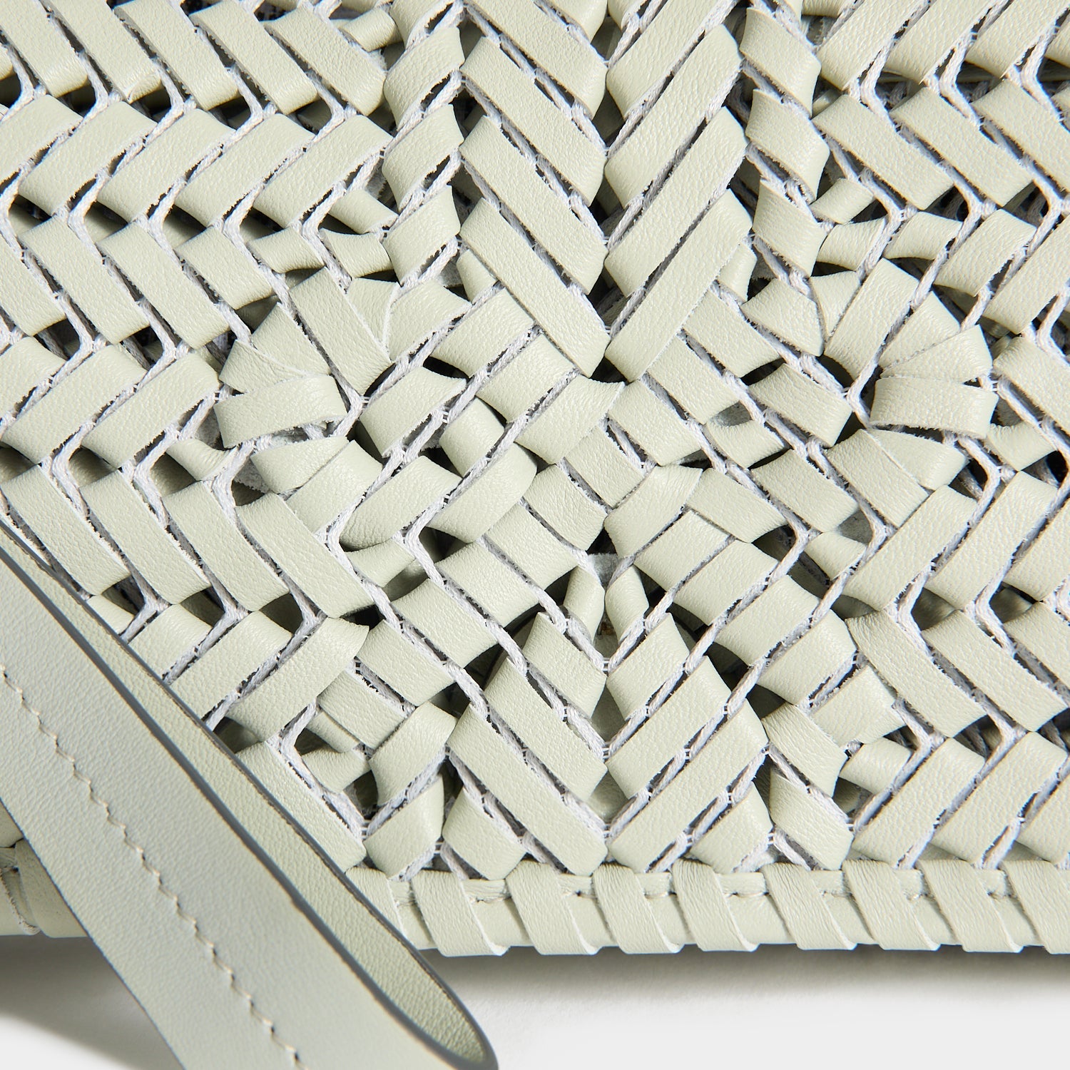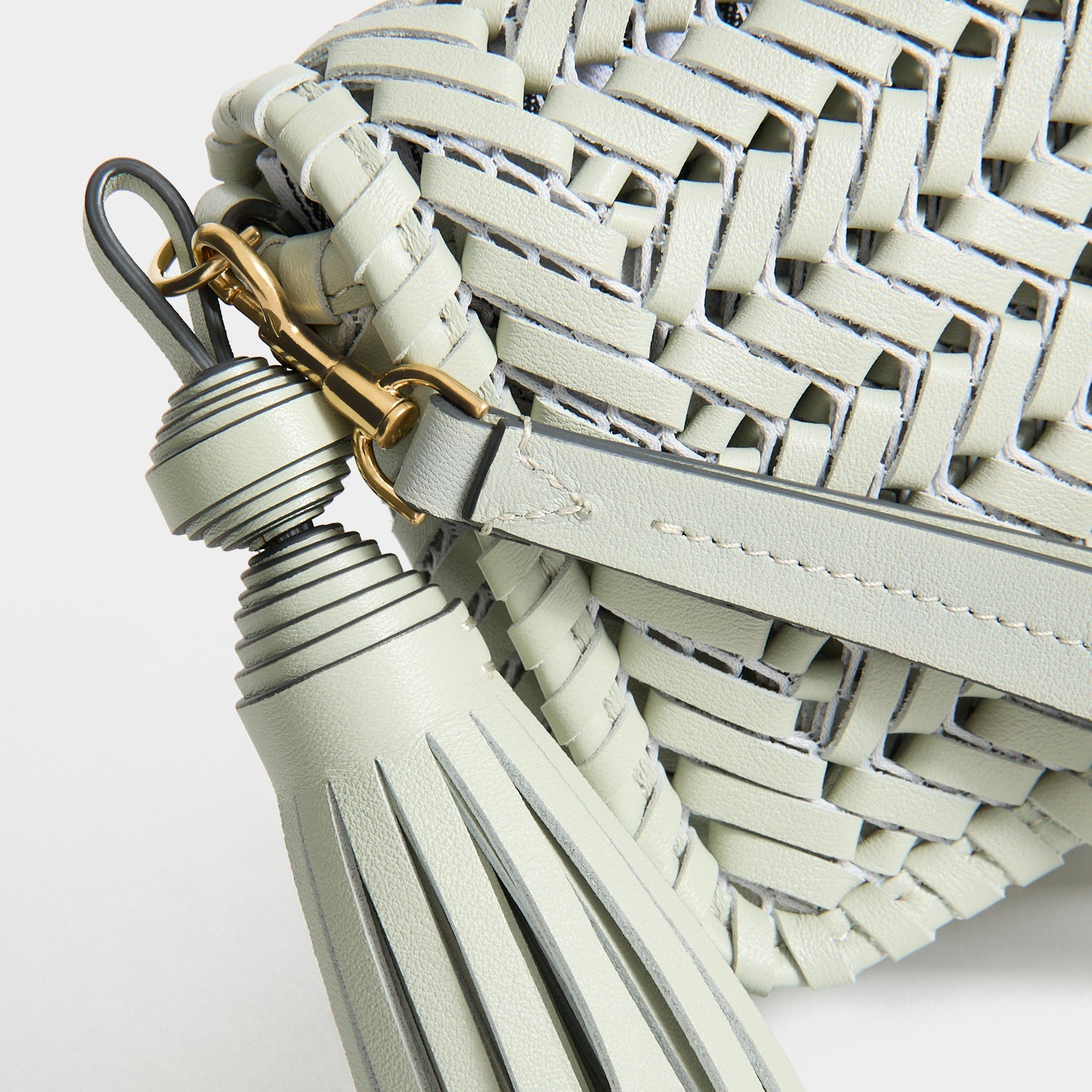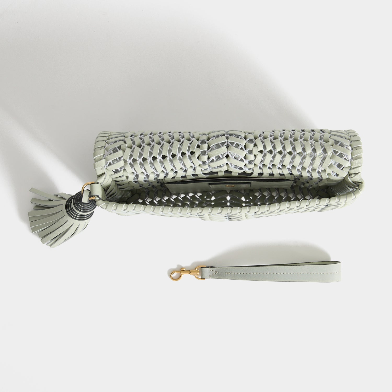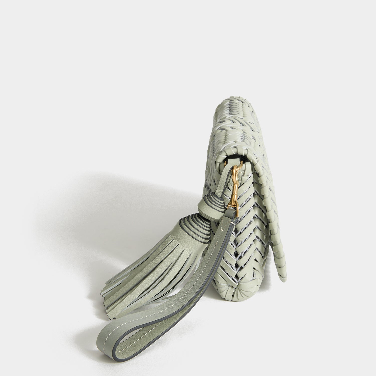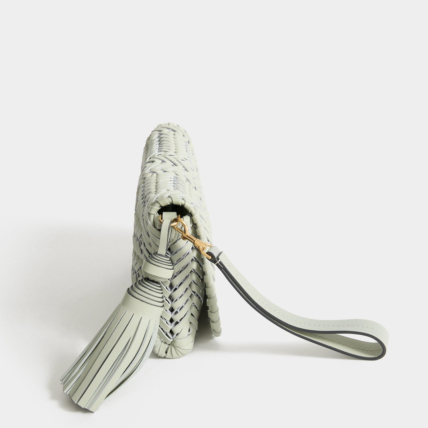 Several hours of craftsmanship goes into the Neeson Tassel Clutch, from the handwoven construction to the handmade tassel – here rendered in iceberg-green soft nappa leather. Carry it by the wristlet strap or as a clutch, keeping cards in the purpose-designed internal slots.