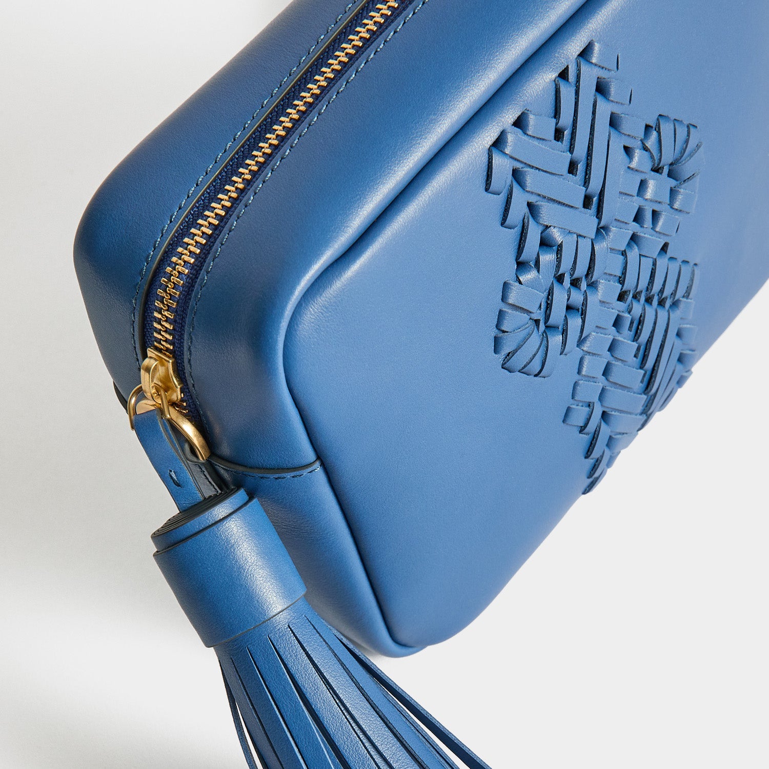 External features: Large tassel zip pull, adjustable and detachable cross-body strap, signature woven Anya Hindmarch bow