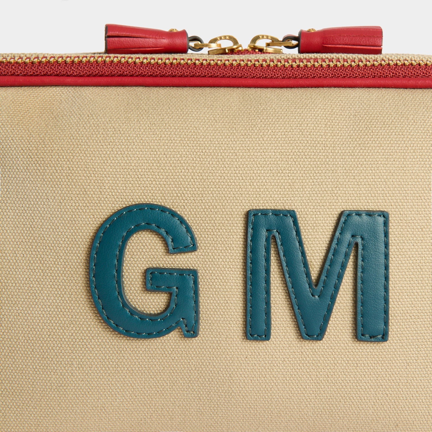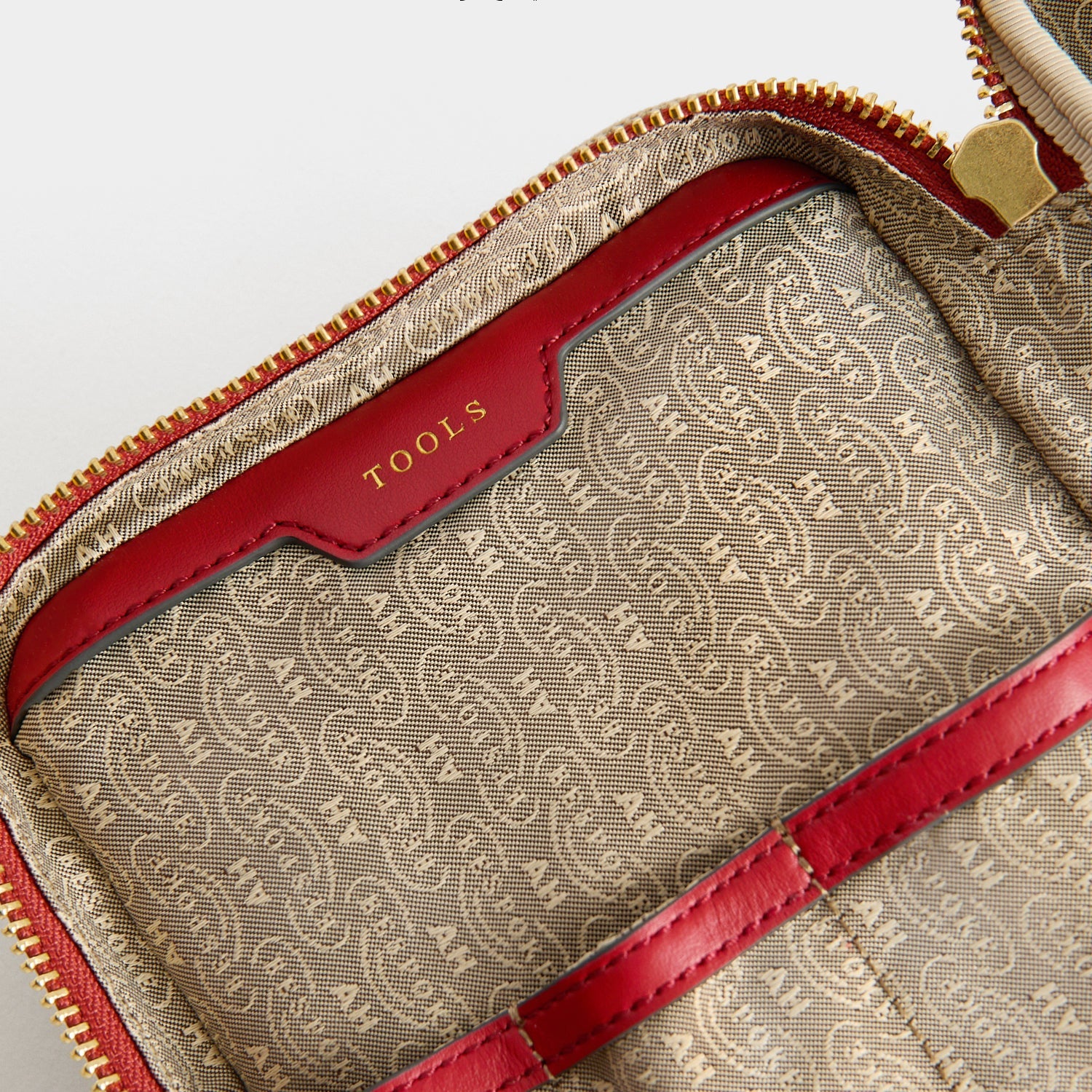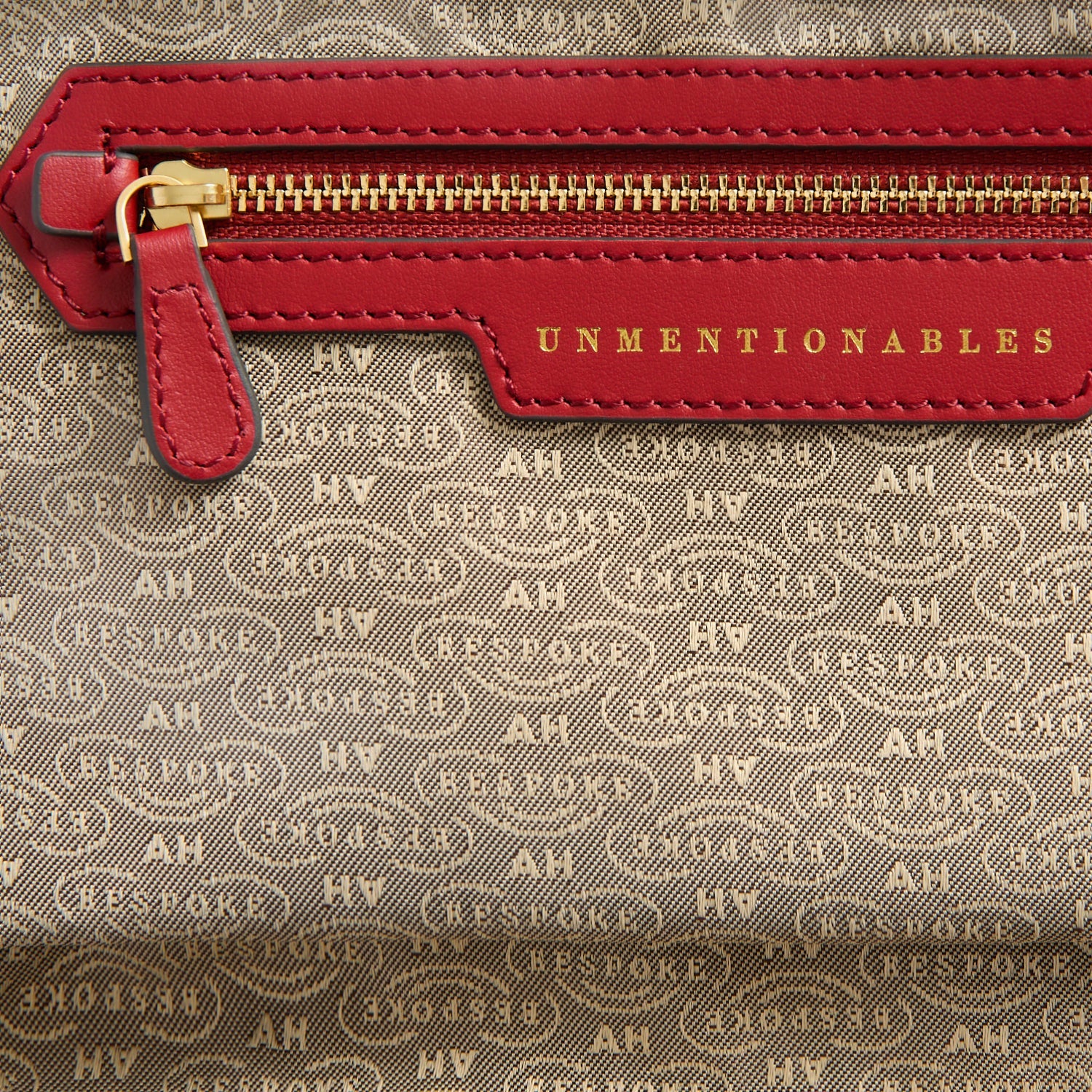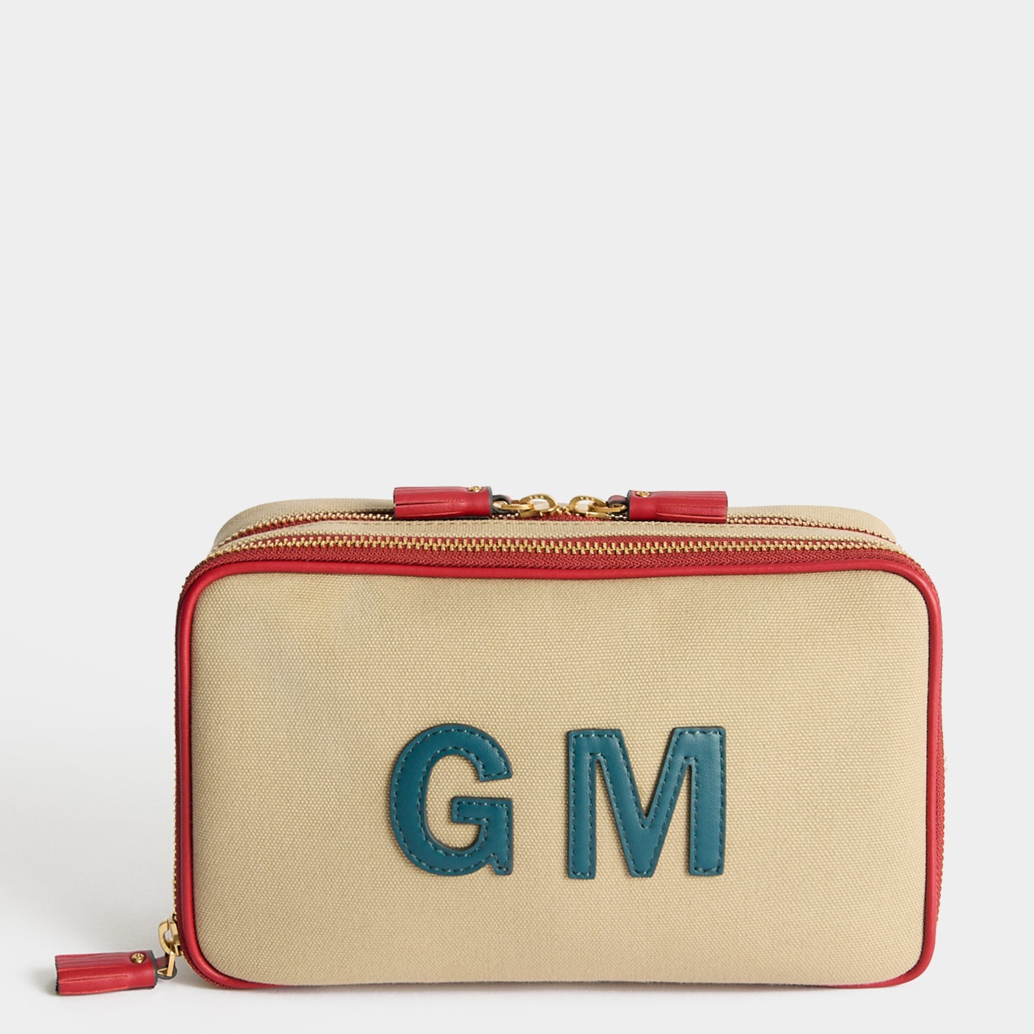 Details: Two sections. Top section has a zipped pocket labelled ‘UNMENTIONABLES’ and an open pocket labelled ‘TOOLS’. Main section has a zipped pocket. Applique leather initials and leather tassel zip pulls.