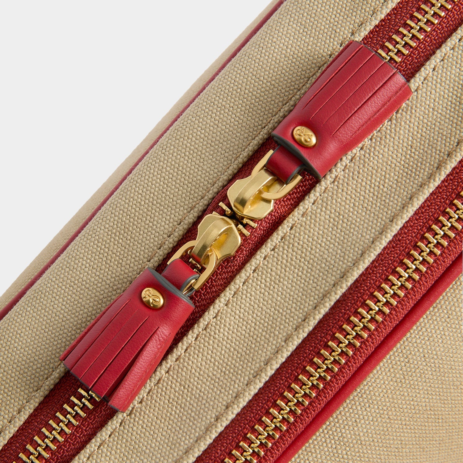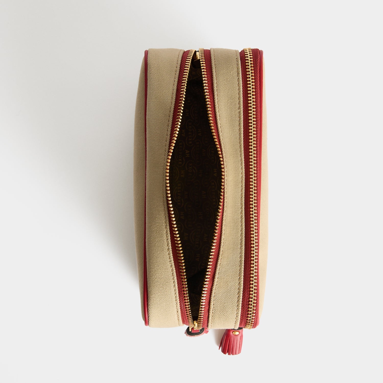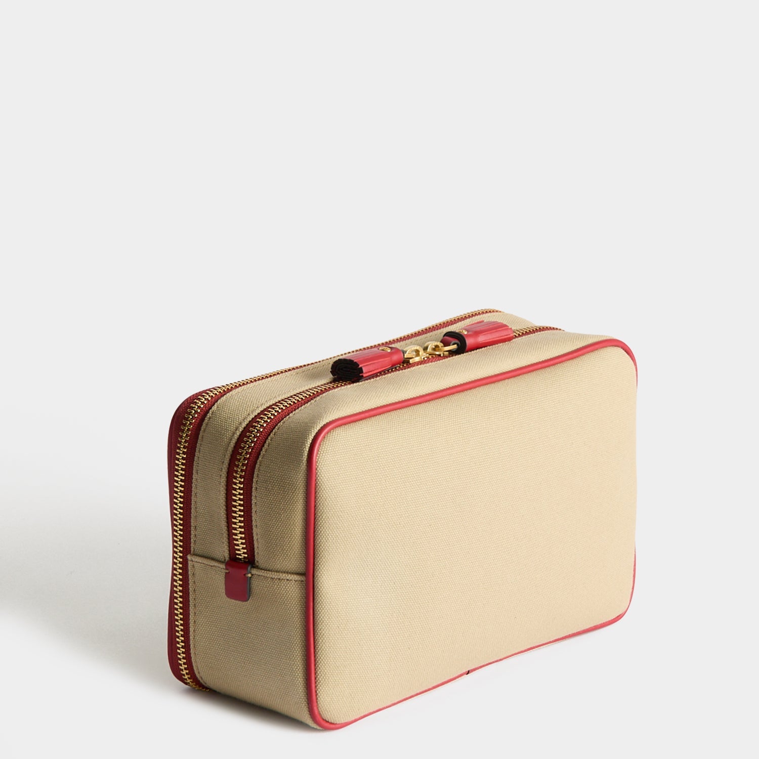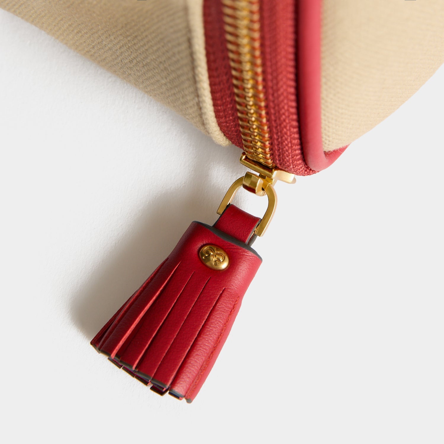 Details: Two sections. Top section has a zipped pocket labelled ‘UNMENTIONABLES’ and an open pocket labelled ‘TOOLS’. Main section has a zipped pocket. Applique leather initials and leather tassel zip pulls.